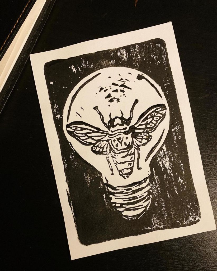 Linocut print/ insect light bulb